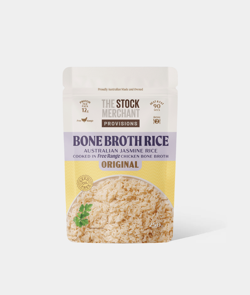 The The Stock Merchant Original Bone Broth Rice is made from Australian jasmine rice cooked in their triple-concentrated free-range chicken bone broth, delivering around 11-12 g of protein per 125 g serving.
